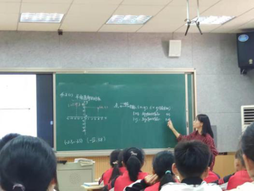 第二节课是八年级(3)班的陈婷婷老师为我们带来的《4.2平面直角坐标系(1)》,陈老师从生活实际出发,用运动会入场式的6×6方阵让学生回顾了上一节课的有序数对,再提问其他班级同学的位置是不是也可以这样表示出来,从而引出平面直角坐标系。再通过读几个关于坐标轴对称的特殊点的坐标引导学生发现点到坐标轴的距离与坐标的绝对值之间的关系,用绝对值很大的四个点引出象限的概念,最后让全班同学参与游戏来巩固所学知识,激发学生的积极性。本节课突出“以教师为主导,学生为主体”的教学原则,学生参与度高,活泼主动,乐于探索,效果较好。
