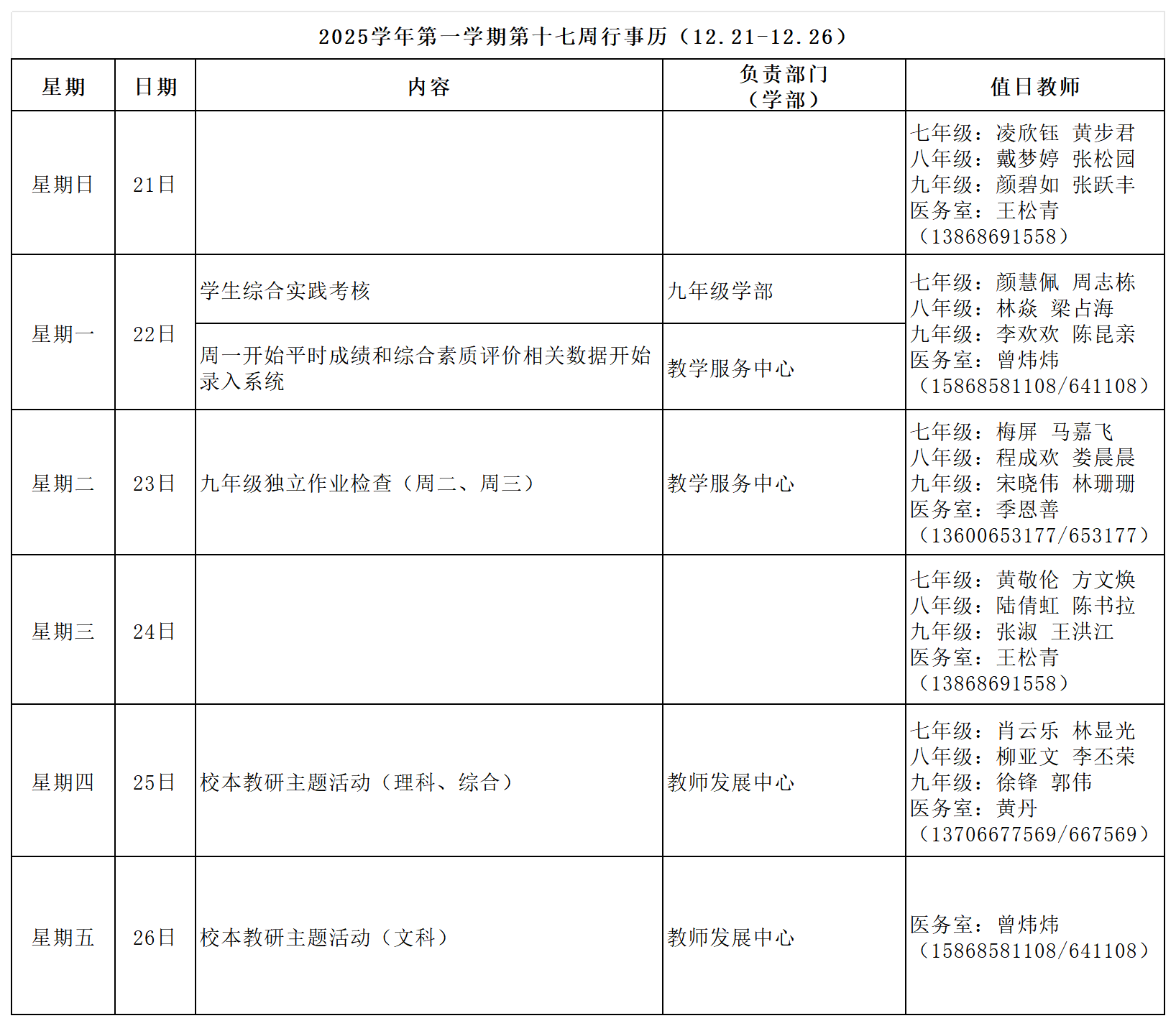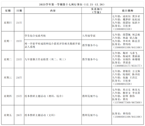 2025学年第一学期第十七周行事历(12.21-12.25) 作者: 发布时间:2025-12-19 浏览量:
